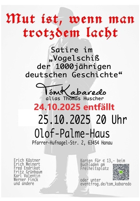 Tóm Kabaredo alias Thomas Huscher lädt zu seinem neuen Programm „Mut ist, wenn man trotzdem lacht“ über die mutige und gefährliche Welt der Satire im Dritten Reich. In einer Zeit, die von Unter-drückung, Zensur und Angst geprägt war, wagten es einige wenige, mit spitzer Feder, scharfem Wort und kreativem Witz den totalitären Wahnsinn zu ent-larven.
